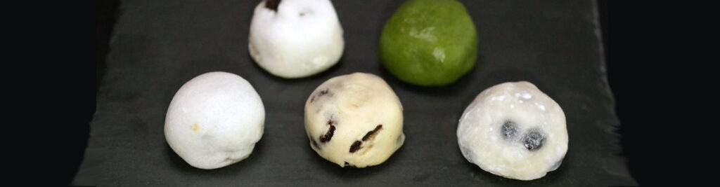 二代目が製菓学園時代の経験を生かし、もちもちの食感にこだわり蓬(ヨモギ)の香り華やかな60年以上変わらない味。